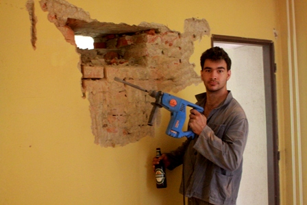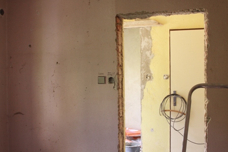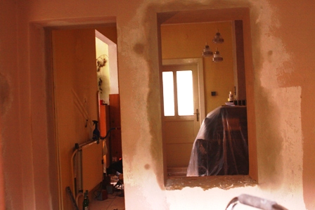 Tady někde bývalo okno... říkal David a já s vyhledávačem elektrického vedení přejížděla po zdi a vyhledávala kovové pruty, které by měly být v bývalém překladu. Oproti mému přání bylo okno o polovinu menší. Co naděláme. Potřebujeme světlo, nastartujme to! Tušila jsem že ve 30 ti stupňovém horku a nulovém pohybu vzduchu to bude masakr, ale netušila jsem, že to trápení bude trvat celý den. Byla to ale ta nejkrásnější díra do zdi, kterou jsem kdy v životě viděla. To mi můžete věřit!