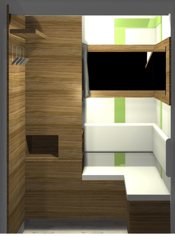 Nakonec prošel návrh hlavní úpravou, které doufám nebudu litovat - kvůli kapacitě botníků, versus Davídkově požadavku na výšku sedáku musí být celá sestava až od země. Mezera pod botníky měla sloužit k a"odkopávání" bot tak, aby nezůstávaly v cestě a na druhou stranu, abychom nemuseli pořád otevírat a zavírat dvířka... nakonec drahý slíbil, že boty bude určitě uklízet, a tak jsem se nechala přesvědčit.