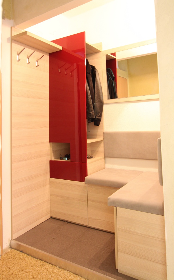- věšáky slouží pro návštěvy, nechci, aby zde vysela hromada oblečení, která přivítá každého příchozího. Proto za svisle umístěnou deskou máme ramínka ss šatní tyčí, kde věšíme bundy. Dlouhý zimní kabát se však zřejmě na věšáku usídlí...